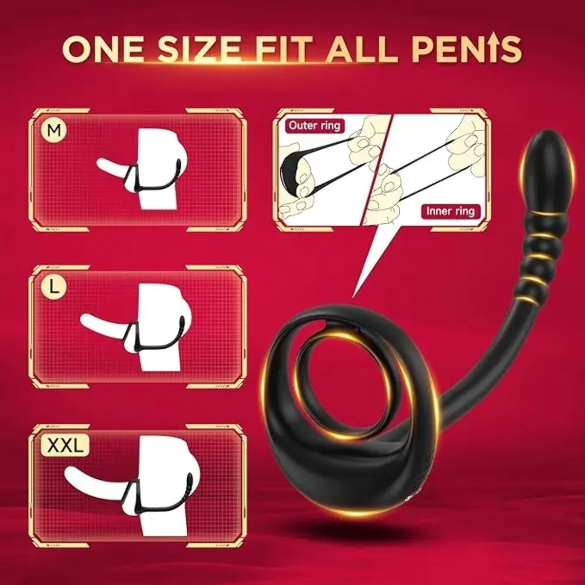 - 3 in 1 Doppelte Penisring + Perineum-Stimulator + Analperlen für gleichzeitige Stimulation von Penis, Analbereich, Perineum und Hoden.