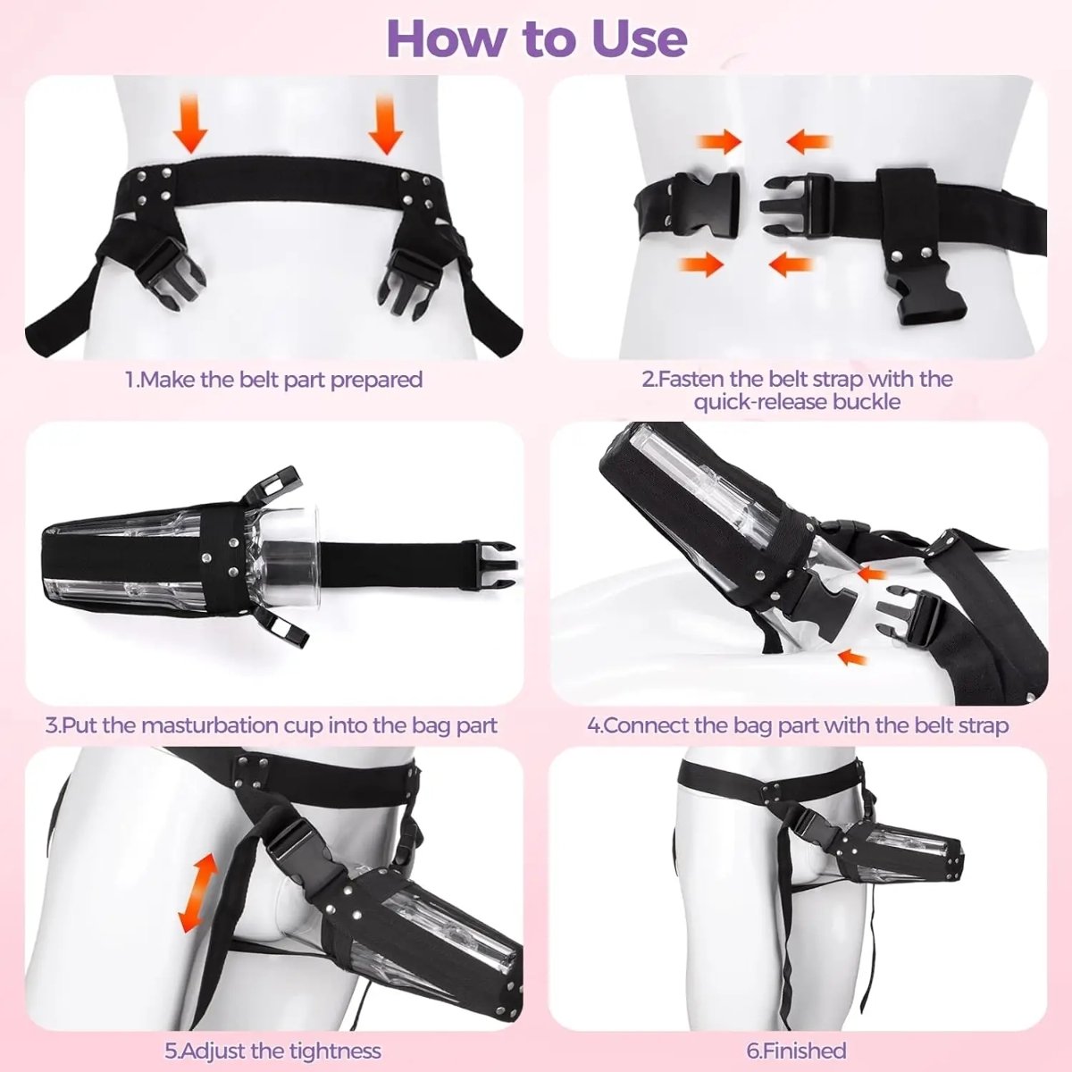 Die Anwendung des Gurtes ist einfach: Bereiten Sie den Gurt vor, befestigen Sie ihn mit der Schnalle, setzen Sie Ihre Masturbator-Tasse in die vorgesehene Tasche ein, verbinden Sie sie mit dem Gurt und passen Sie die Enge nach Ihren Wünschen an. Mit diesem Produkt können Sie neue Empfindungen erkunden und freihändigen Genuss wie nie zuvor erleben. Steigern Sie Ihre intimen Erlebnisse mit dem Aiersha Tragegurt für Masturbator-Tasse noch heute!
